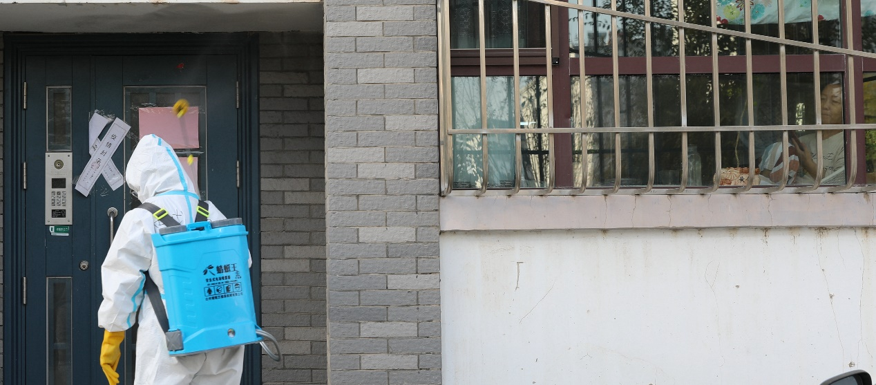 她们说,每天她们要背着满满一箱子消毒水来来去去穿梭于小区各个地方,消垃圾车、垃圾桶、楼门口、楼道,凡是经过的地方都进行消毒。