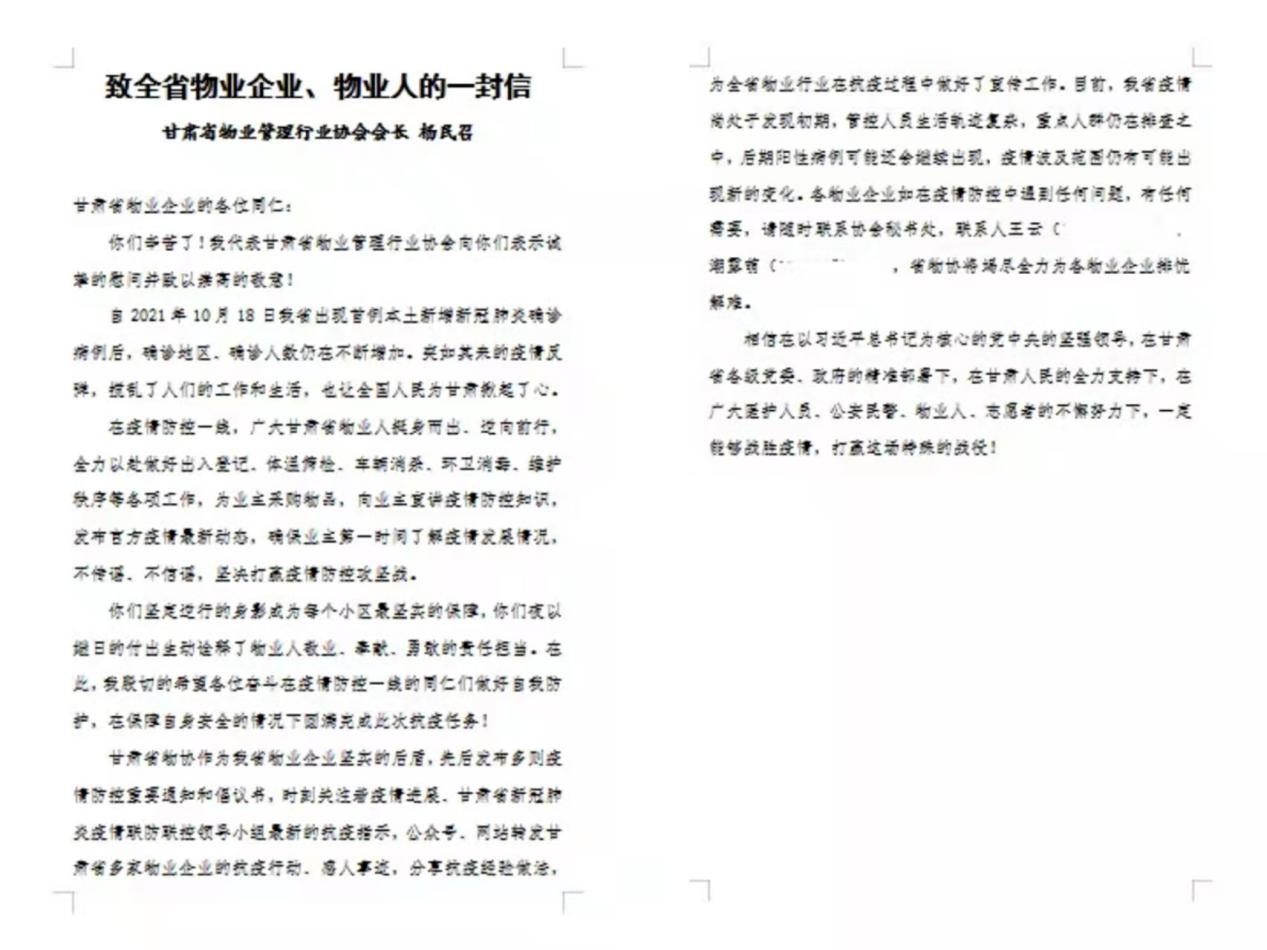 天水市恒顺佳和物业公司以最快速度响应疫情防控要求,除必须居家隔离的人员外,剩余物业员工主动放弃回家,全体到岗10天内配合社区组织入住人员开展大规模核酸检测10余次。高频无死角消杀260余次,近300次物资配送竭力保障民生需求。